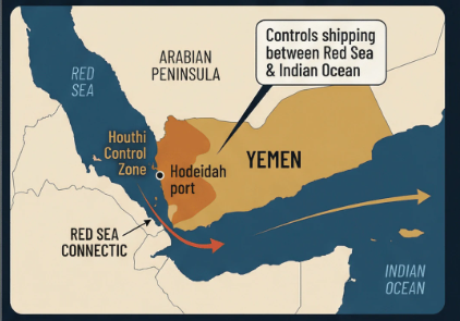 For India, the implications are severe and multifaceted. While nearly 50% of India’s crude imports transit through Hormuz, the disruption at Bab-el-Mandeb threatens LNG supplies from Qatar and re-routed Saudi crude from the Yanbu port. Beyond energy, the strait handles nearly 20% of global container traffic, including food and machinery.